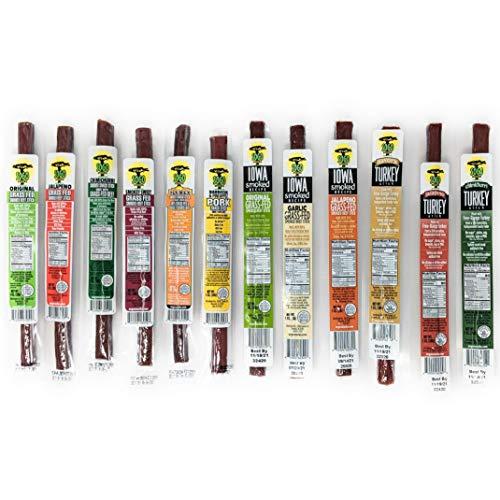 - 12 FLAVORS IN 1 PACK - Our meat variety pack includes Original, Jalapeo, Smokey Sweet, Chimichurri, Tex-Mex, Iowa Smoked Original, Iowa Smoked Garlic and Iowa Smoked Jalapeo Grass-Fed Beef Sticks. Savory, Chimichurri and Jalapeo Free-Range Turkey Sticks. Barbecue and Pineapple Natural Pork Sticks.