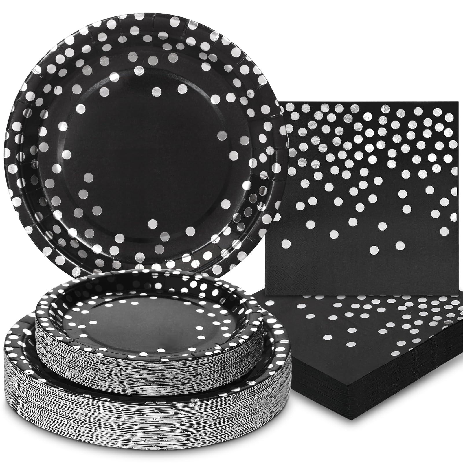 - Unique Design: These black party plates and napkins sets are designed with a combination of black background and large silver dots, full of nobility, while these black paper plates and napkins will bring a different sense of high-level to your prom and indulge your guests.