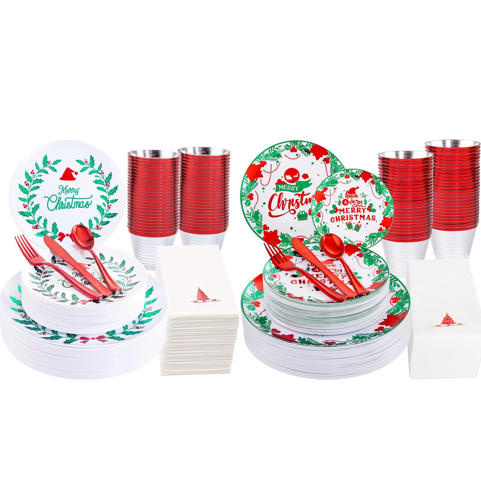 - MULTIFUNCTIONAL HOLIDAY SET: This Christmas plate set contains 50 high quality plastic plates, 75 red plastic cutlery, 25 red plastic cups, 25 Christmas tree napkins, enough for your Christmas party. Whether it's a banquet, family gathering or office occasion, the Christmas party plates are the perfect choice. ELEGANT DESIGN: Each Christmas plastic plate is beautifully decorated with berries and leaves, Santa hat design motifs, bringing a strong Christmas holiday atmosphere. These patterns i