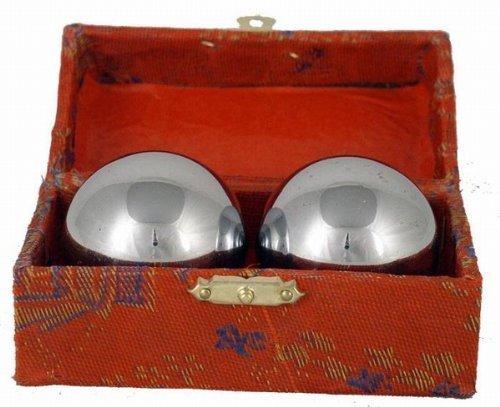 Chinese Healthy Balls stimulate and exercise your hands muscles by moving both of them in one hand. The balls are metal, hollow and have chiming sounding plates inside. They make crisp and rhythmical sounds when moving.Play them to relax and reduce stress. Each ball is about 2" in diameter.