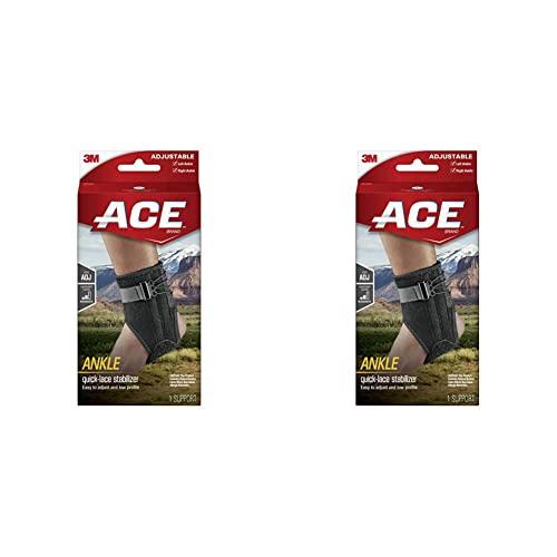 The ACE Ankle Brace with Side Stabilizers provides adjustable compression and support for ankles. This unisex ankle brace has a hook and loop closure for easy wear. It features reinforced side stabilizers to limit lateral motion and breathable materials to keep skin dry. The adjustable design allows you to customize the compression and support as needed for comfort. This pack contains 2 ankle braces, each weighing 0.19 kilograms. The ankle braces are made for adults and designed for walking. Hand wash only.
