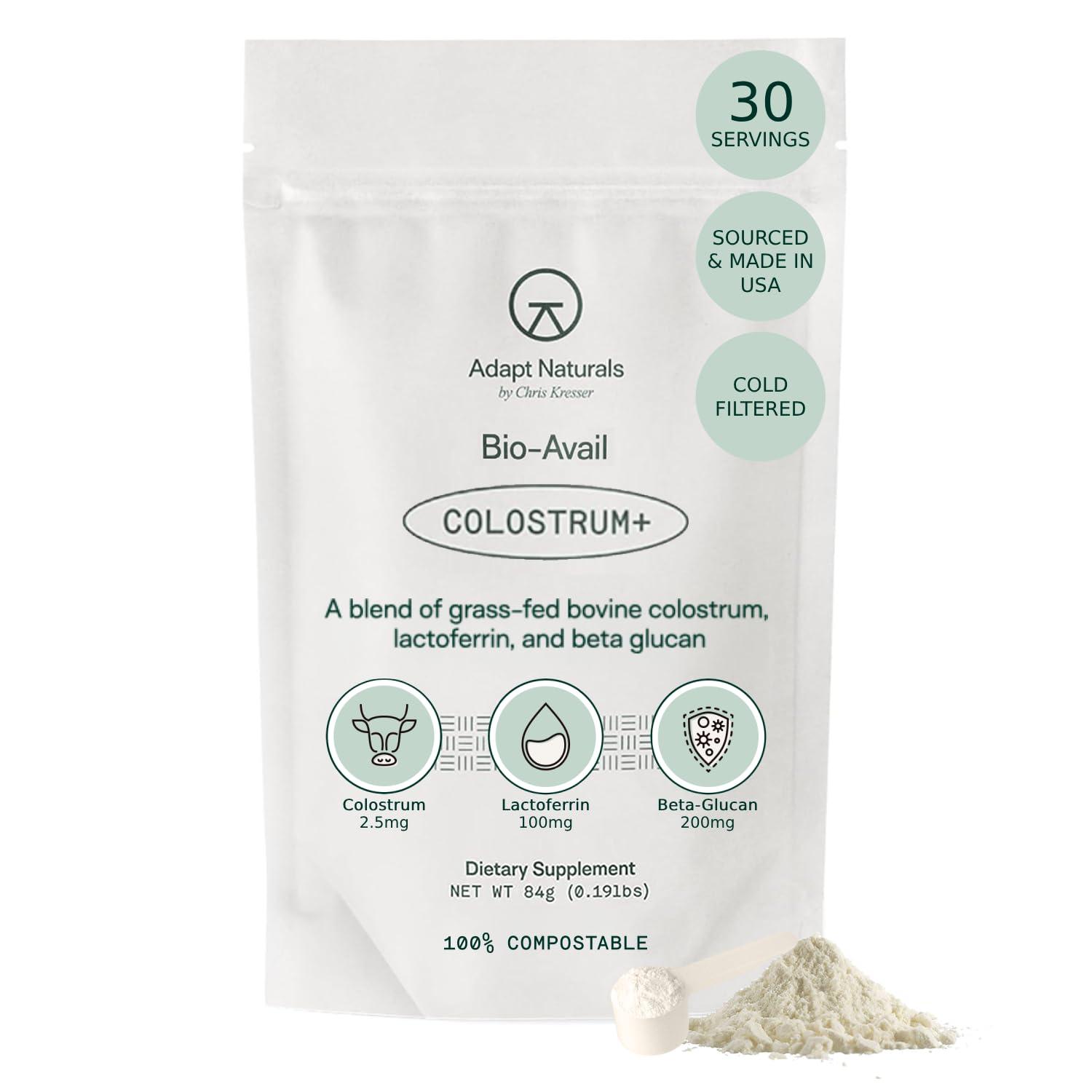 - Adapt Naturals Bio-Avail grass fed colostrum with lactoferrin and beta glucan - 2500mg of colostrum, 2.5x more than average, plus 100mg of lactoferrin and 200mg of beta glucan per serving.