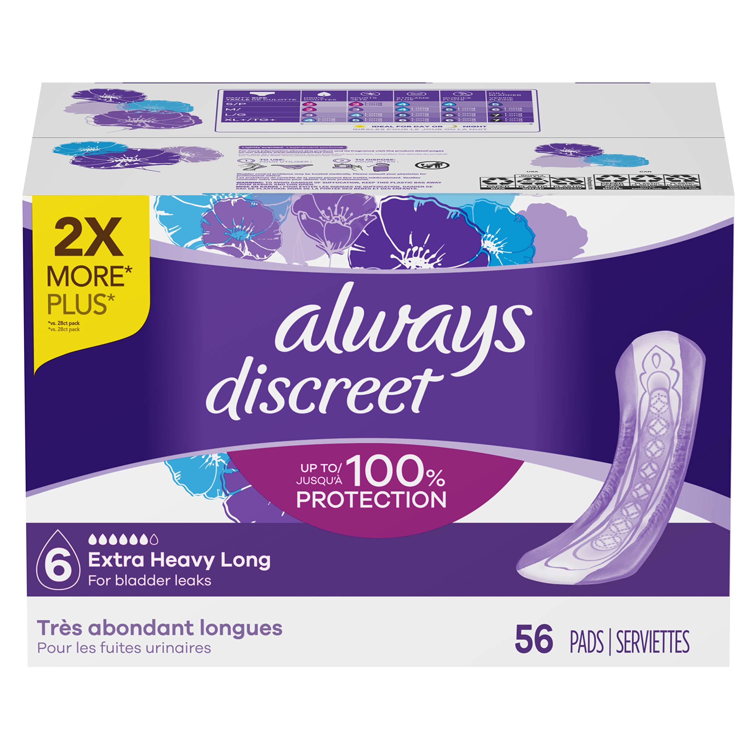 Looking for incredibly strong bladder leak protection, that is barely noticeable under clothes? Always Discreet Extra Heavy Long Incontinence Pads offer up to 100% leak-free protection thanks to a unique absorbent core that absorbs leaks in seconds to keep your skin dry and comfortable for hours. Plus, two RapidDry layers form a boosted protection zone in the center, giving you extra protection where you need it most. Even with heavy unexpected leaks, the LeakGuards help to keep wetness away from the sides, while the lightly-scented OdorLock technology neutralizes odors instantly and continuously. Find your right size with the Always Discreet My Fit chart and get the protection you need. Experience incredible bladder leak protection in a surprisingly discreet incontinence pad.