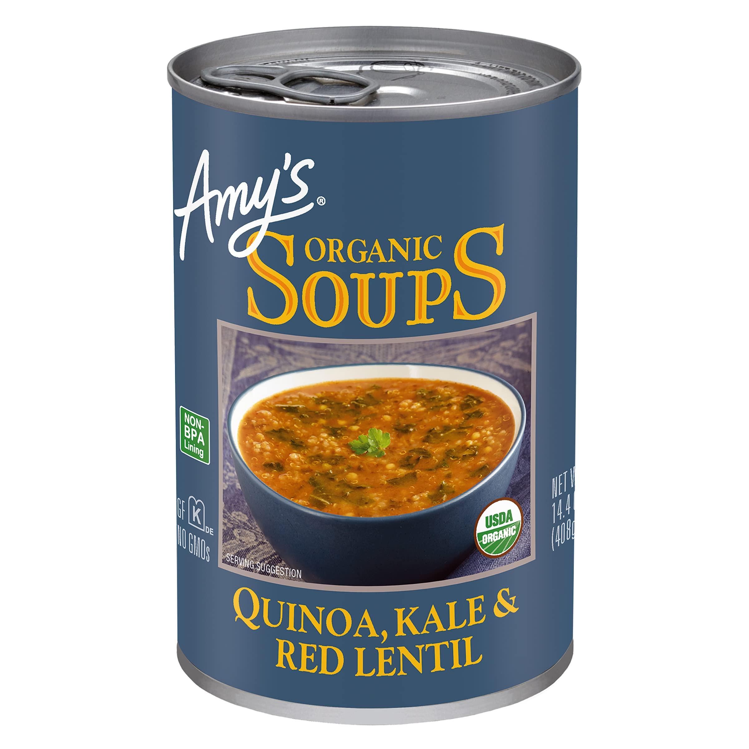 Packed with plant power, this tasty soup is so hearty that its a meal on its own. We make Amys Quinoa, Kale & Red Lentil soup from scratch with the highest quality organic ingredients, taking our time to cook the grains and veggies with organic cilantro, green onions and a bit of jalapeo pepper for a rich, complex flavor. Its ready to eat in minutesjust heat and serve. A great source of plant based protein and fiber, this robust soup is also gluten free, dairy free, soy free, corn free, tree nut free, vegan and certified kosher. Since 1987, we at Amys Kitchen have produced delicious, organic, convenient foods for people who are sometimes too busy to cook. Amys is a family-run business, and we supervise every aspect of our business and take pride in customer satisfaction. All the fruits, vegetables and grains we use are grown without the use of insecticides, GMOs and other harmful chemicals. We prepare these ingredients with the same careful attention in our kitchen as you would in your own home for high-quality, home-style vegetarian and vegan meals. No meat, fish, shellfish, poultry, eggs or peanuts are ever used in any Amy's products. Even though you're heating up our meals in your home, we want each bite to taste like you're a guest in ours.