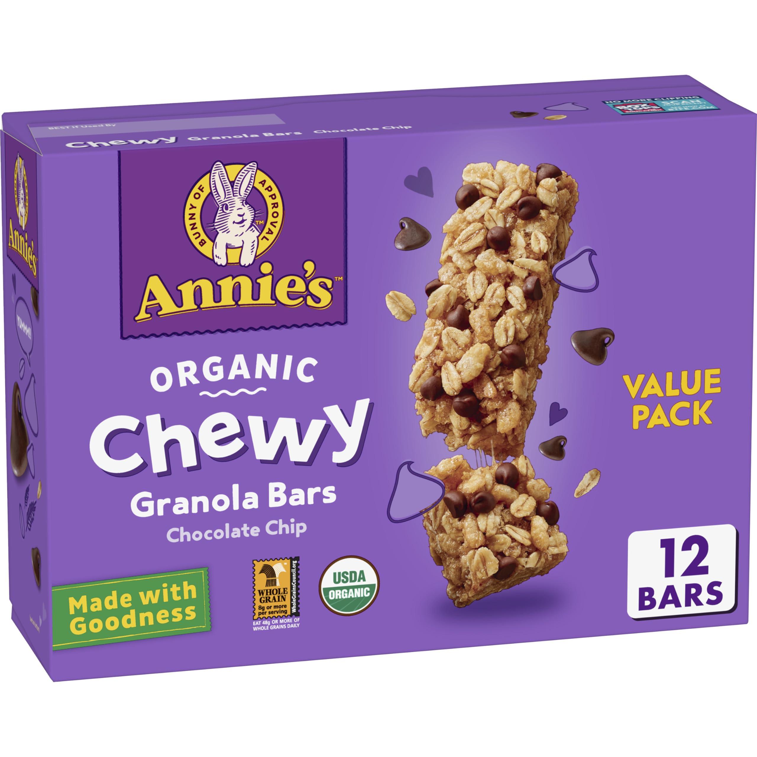 Chewy, chocolatey, and perfectly portable, Annie's Chocolate Chip Chewy Granola bars set the bar high. Meet your go-to granola bar, with undeniably delicious chocolate-y taste, chewy texture, and eight grams of whole grains per serving. Annie's Organic Chewy Granola Bars are made with a delicious new taste & chewy texture, these bars are Certified Organic. Oh, and never fear, you wont find any of that artificial junk lingering here. A portable snack perfect for the pantry, lunch box, and hiking trail. Stock up for a breakfast snack bar, an office snack or an on-the-go treat the whole family can enjoy. Contains 12 bars in total.