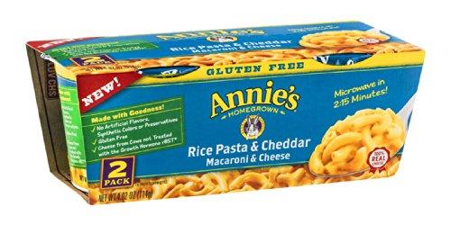 Annies gluten free microwavable mac and cheese cup, Rice Pasta & Cheddar, is also available as a 2 pack. Its made with rice pasta, 100 Percent real cheese and no artificial flavors, synthetic colors or preservatives. Just add water, microwave 2 15 minutes and enjoy.