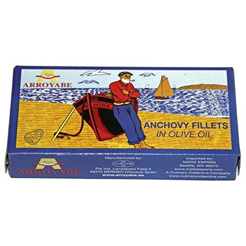 Processing anchovies in Cantabria is still a traditional art, and Arroyabe anchovies are produced and hand-packed according to time-honored methods. Upon arriving fresh to the processing facility, they are gutted, placed in barrels with salt-layer separations and weighted to bring the water and fat to the surface. Once the fish has matured for between 3-7 months, it is washed, de-boned, and tinned with olive oil. Use anchovies as a natural source of savory umami flavor in your dishes toss with pasta, mix into sauces, or serve atop salads.
