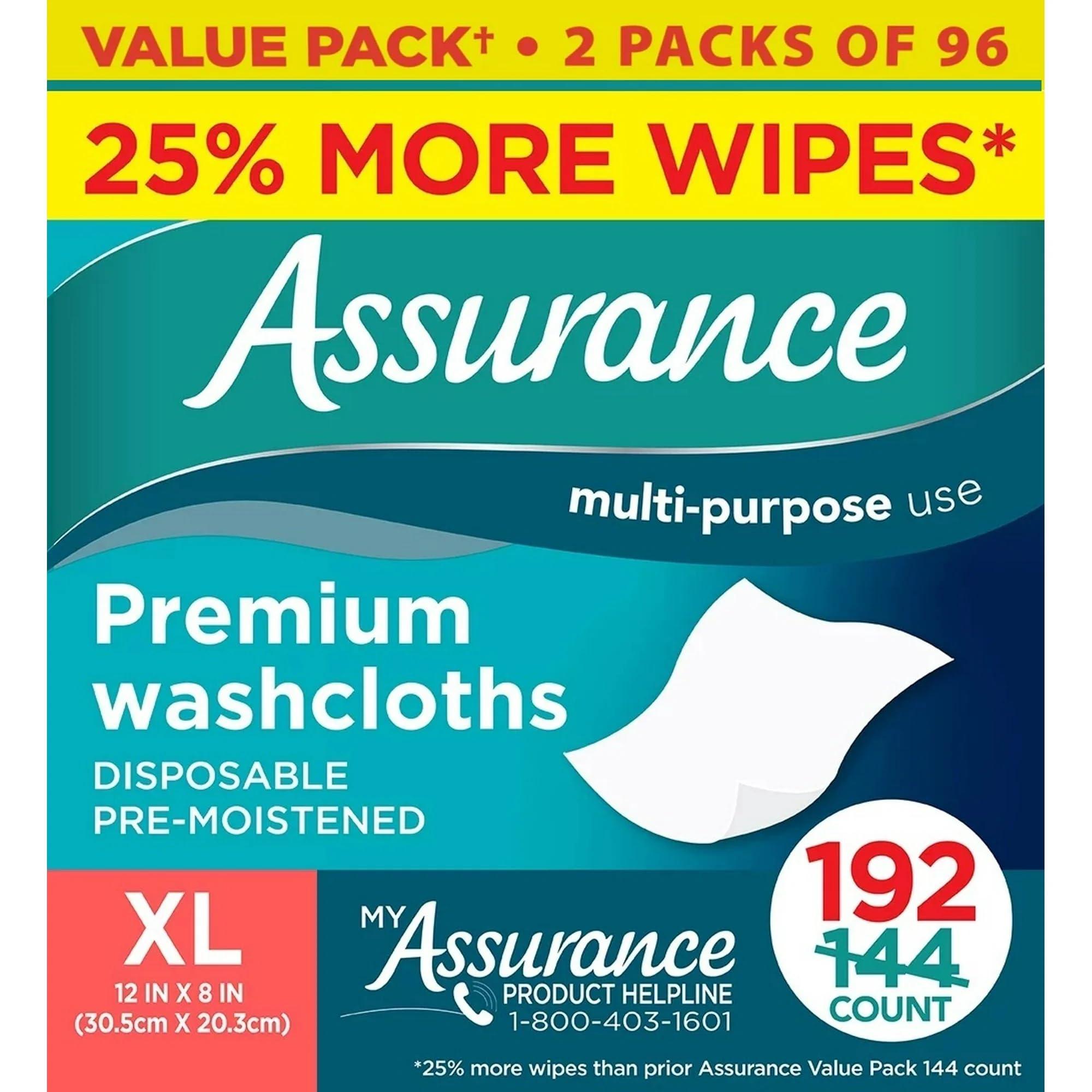 tay fresh and clean whether you are on a long road trip or running late at home with Assurance Premium Extra-Large Disposable 192 Count Washcloths. Now with 25% more wipes! * They are enhanced with softness and strength with the utility of facial tissue. The pre-moistened wipes are very helpful for promoting convenient personal hygiene no matter where you are. Assurance disposable washcloths provide all the cleaning power that you would expect in a shower, except you don't need water and they can be tossed in the trash when you are done using them. Strong and treated with lotion for a gentle cleansing experience, they are generously sized for full personal cleaning. These handy accessories even have vitamin E, aloe and chamomile for added benefits to the skin after use. They are a solid option for on-the-go sanitary wipes or outdoor adventures when bathing is not feasible. Be assured of freshness and cleanliness wherever life goes with these 192 Count Assurance Premium Extra-Large Disposable Washcloths. *25% more wipes than prior Assurance Value Pack 144 Count Assurance Premium Disposable Washcloths, XL (192 Count) Stay fresh and clean whether at home or on the go Enhanced for softness, strength, and a washcloth-like texture Provides all the cleaning power of traditional soaped hand towels and is also disposable Now with 25% more wipes than the prior Assurance