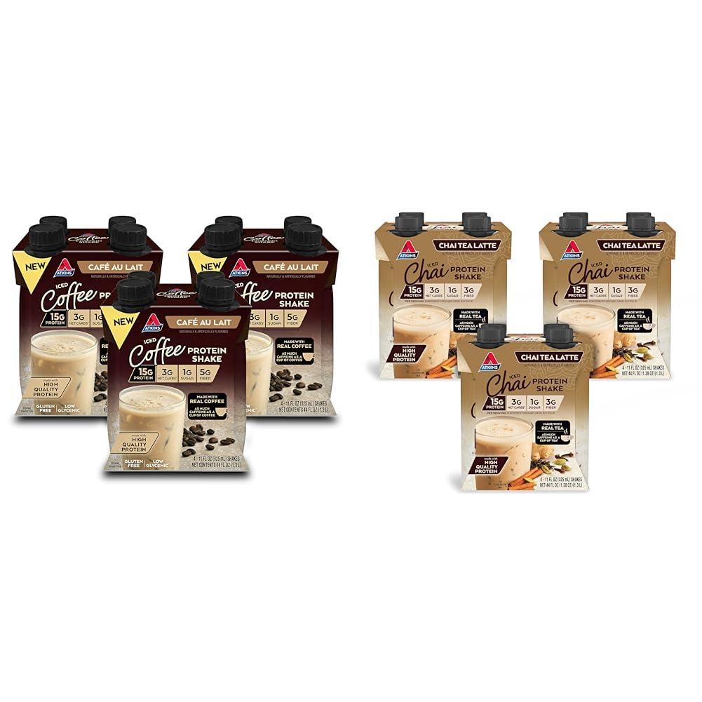 - Product 1: AT HOME OR ON-THE-GO. Atkins Caf au Lait Iced Coffee Protein Shakes. Enjoy delicious shakes that fit right into your busy schedule, with 15g of protein, 3g of net carbs, 1g of sugar per serving*, and as much caffeine as a cup of coffee. This is Todays Atkins.