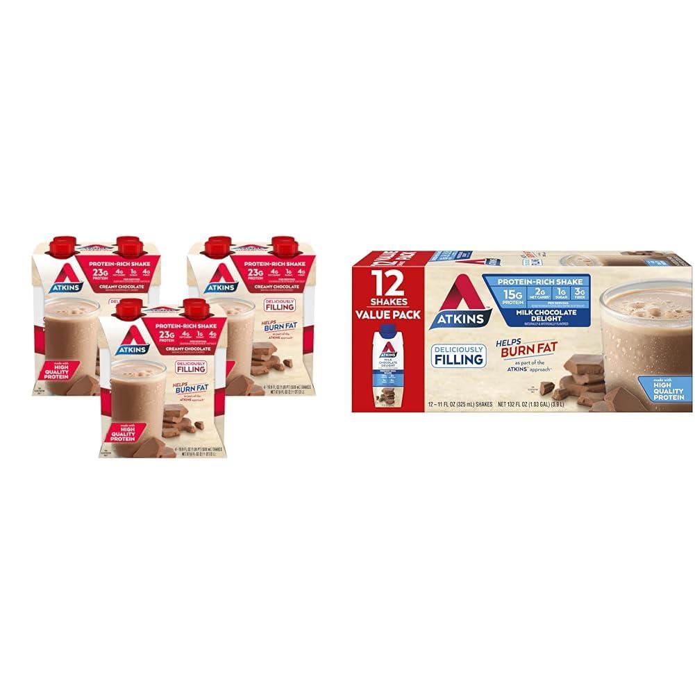- Product 1: AT HOME OR ON-THE-GO. Atkins Meal Size Creamy Chocolate Protein Shakes. Enjoy delicious shakes that fit right into your busy schedule, with 23g of protein, 4g of net carbs, and 1g of sugar per serving*. This is Todays Atkins.