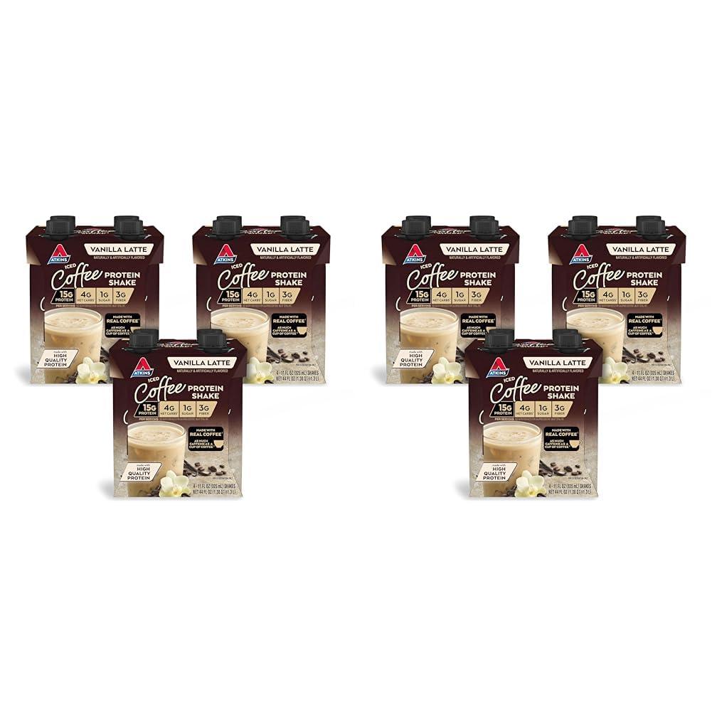 - AT HOME OR ON-THE-GO. Atkins Vanilla Latte Iced Coffee Protein Shakes. Enjoy delicious shakes that fit right into your busy schedule, with 15g of protein, 4g of net carbs, 1g of sugar per serving*, and as much caffeine as a cup of coffee