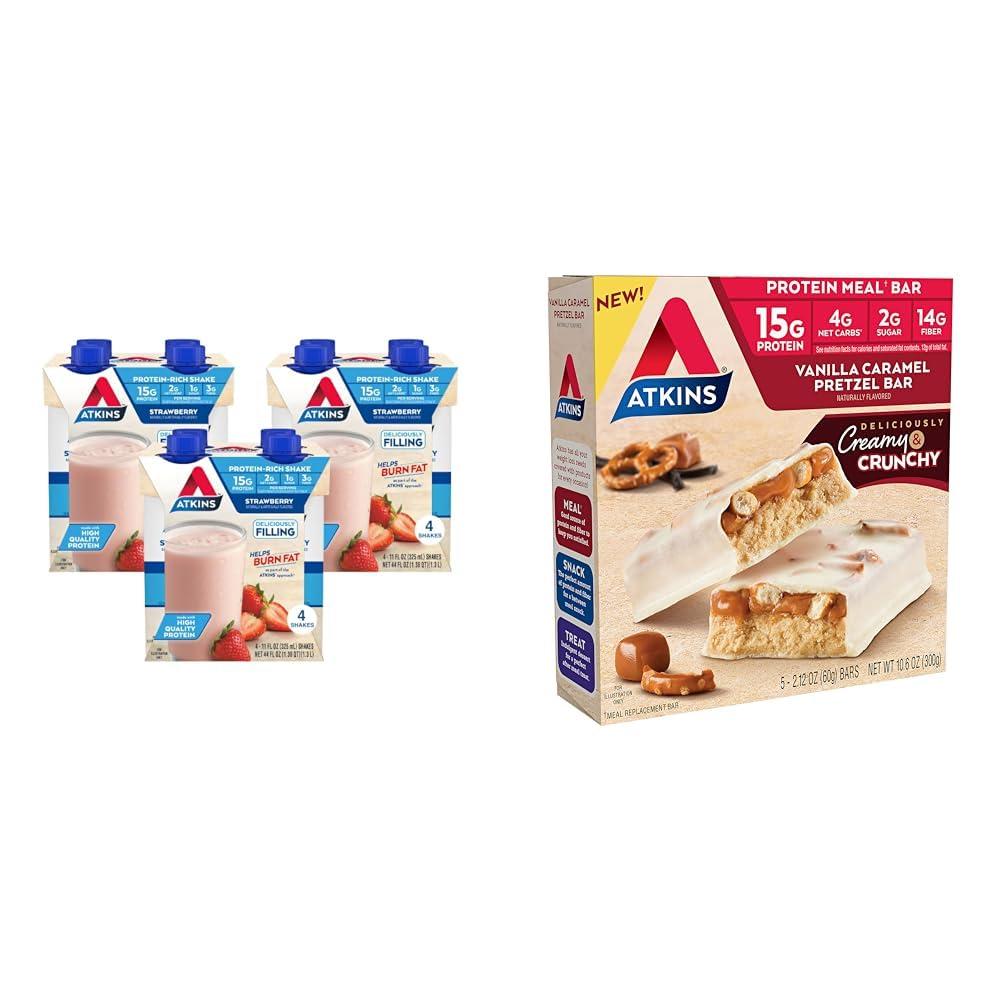 Enjoy delicious and nutritious snacks that complement your active, on-the-go lifestyle with this protein shake and meal bar bundle. The bundle includes 12 counts of Atkins Strawberry Protein Shakes, each with 15g of protein, 2g net carbs, 1g sugar, and only 110 calories to satisfy hunger and support energy levels. The gluten-free, keto-friendly shakes make smart choices when you need portable nutrition. Complementing the shakes are 5 counts of Atkins Vanilla Caramel Pretzel Protein Meal Bars. Each crunchy, sweet and salty bar delivers 15g protein, just 2g sugar, 4g net carbs, and 190 calories. Between the shakes and bars, you'll have nutritious and great-tasting snacks for active days. Both Atkins snacks are made with quality ingredients and contain a good source of fiber to help you stay true to your low-carb lifestyle. The shakes and bars deliver the protein and limited carbs and sugars you want in snacks designed for life on the go.