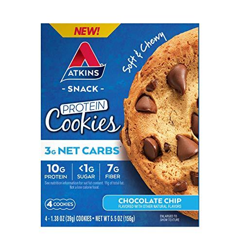 - Atkins Chocolate Chip Protein Cookies provide a sweet chocolate chip cookie treat with 10g protein, 3g net carbs, 1g sugar per cookie*