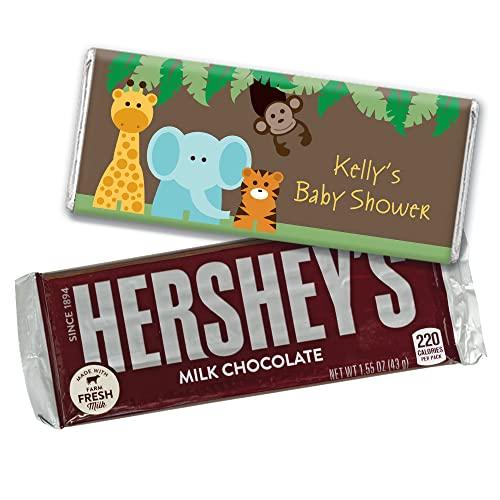 These personalized candy wrappers are the ideal chocolate party favor for an animal-theme baby shower. Have a wild time at the baby shower with these darling jungle theme baby shower favors. Adorable jungle animals push the cuteness factor into overdrive in celebration of the coming baby. Customized HERSHEY'S candy bars make a great impression at your party. Design: Personalized candy wrappers with cute jungle animals Color: Brown Paper: High gloss paper with four color print. Size: Standard 1.55 oz BarContents: Genuine HERSHEY'S Chocolate Coordinating Products: SHK06Designed By: The WH Candy Graphic Design Team