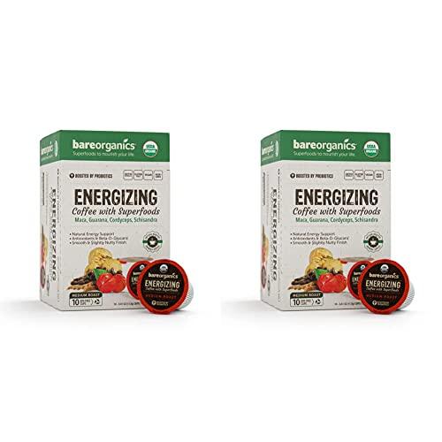 Enjoy an energizing cup of organic coffee infused with superfoods and probiotics with this pack of 2 BareOrganics USDA Organic Coffee Pods. These vegan and gluten-free coffee pods are compatible with Keurig K-Cup brewers. Each pod contains 132mg of caffeine from organic coffee beans. The coffee is flavored with organic chocolate and contains no artificial flavors, colors or preservatives. The BareOrganics coffee pods come in a box with 2 pods, providing a convenient way to enjoy organic, vegan and gluten-free coffee.