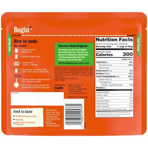 BEN'S ORIGINAL READY RICE Cilantro Lime Flavored Rice, Family Size makes it easier than ever to create a tasty meal in minutes. This long grain rice comes fully precooked with fresh pops of cilantro and a flavorful lime finish that will enhance any cooked rice meal. Available in a BPA-free microwavable rice pouch, BEN'S ORIGINAL READY RICE allows you to enjoy delicious parboiled rice without any prep or cleanup. Prepare this delicious side dish by placing the rice pouch in the microwave and cooking for 2 minutes. You can also pour the contents into a skillet, add 1/4 cup of water and heat until it is ready to serve. This cilantro lime rice side dish tastes great with tacos or served plain with your favorite protein. It is vegetarian and contains no artificial flavors, colors, trans fat, or cholesterol. BEN'S ORIGINAL is dedicated to creating meals and experiences that offer everyone a seat at the table.