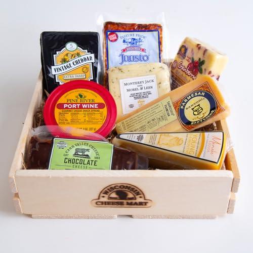 This Wisconsin cheese gift basket includes Chocolate Cheese Fudge with Walnuts, Five Year Aged Cheddar, Port Wine Cheese Spread, Sarvecchio Parmesan, White Cheddar with Cranberries, Morel and Leek Monterey Jack, Marieke Gouda, and Juusto Baked Cheese.
