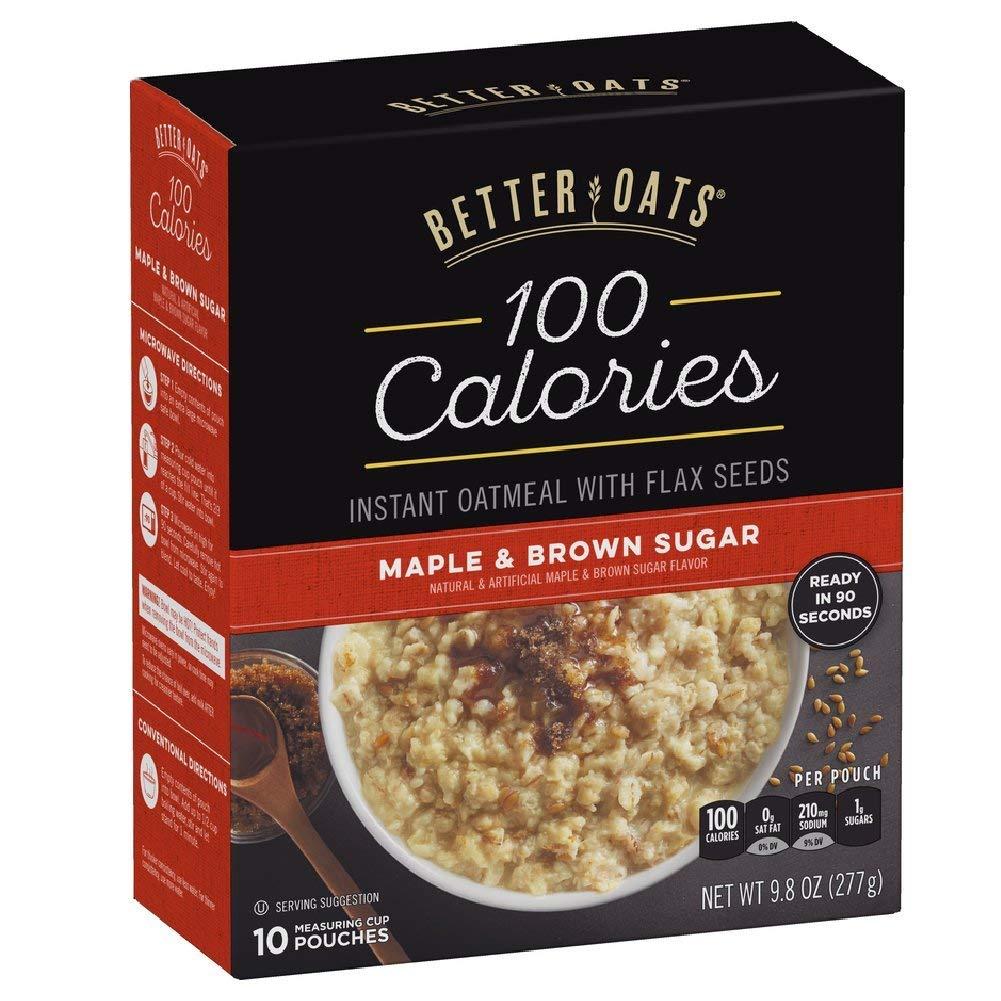 - Better Oats Maple and Brown Sugar Instant Oatmeal is made with whole grain oats and is 100 calories per serving