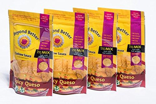 Beyond Better Spicy Queso Cheese Alternative Sauce and Dip Mix makes a rich, creamy, versatile and delicious sauce. Loaded with B12, protein, fiber, and lots of vitamins and minerals. Organic ingredients. Resealable bag. Just add water, boil 1 minute, 1 package makes 24 oz, that's two 12 oz jars! Cure the Craving! (tm)