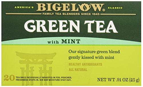 Green With Mint Tea by Bigelow Teas 20 Bag The refreshing flavor of mint provides an invigorating taste to the delicate flavor of green tea that is uniquely different and delicious. 20 individually foil wrapped tea bags per box. 6 boxes per case. Net Wt. .91 oz. (25g). Ingredients green tea mint leaves. Gluten Free.