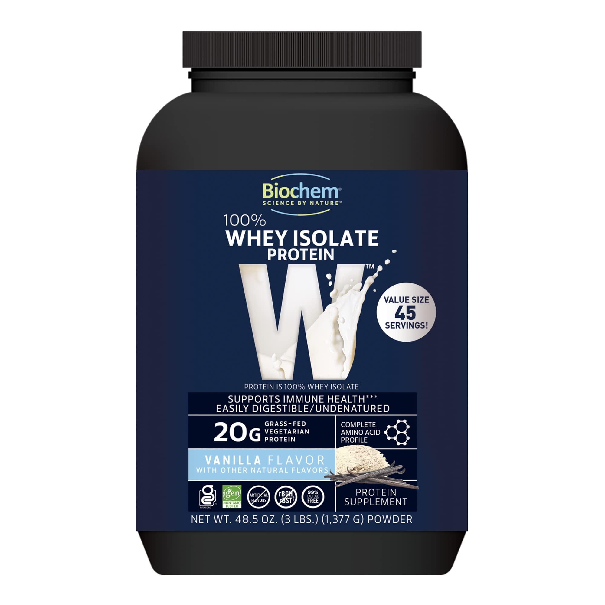 Introducing Biochem's 100% Whey Isolate Protein, the ultimate solution for those seeking a nutritious and convenient meal enhancement. This organic whey isolate protein powder delivers 20g of pure, grass-fed protein per serving, ensuring you receive the highest quality protein powder to fuel your body. Fortified with 20 naturally occurring amino acids, this shake supports muscle growth, recovery, and enhanced energy, making it perfect for athletes, bodybuilders, and active individuals. Biochem's whey protein isolate is not only easily digestible but also boasts a refreshing taste that you'll love. Packed with organic greens and detoxifying ingredients, it promotes digestive and immune health while boosting metabolism. This low-carb vanilla mix is keto-friendly, vegetarian, non-GMO, and sugar-free, making it an ideal choice for those following a healthy lifestyle. Simply add one scoop to water or your favorite beverage and stir until dissolved for a delicious protein drink. Certified gluten-free and made in the USA, this whey protein isolate powder supports intense workouts, strong bones, and lean muscle growth. Whether you're on the go or looking for a quick and healthy option, Biochem's 100% Whey Isolate Protein is the perfect addition to your daily routine. Embrace the benefits of a isolate protein powder that not only tastes great but also supports your overall health and wellness.
