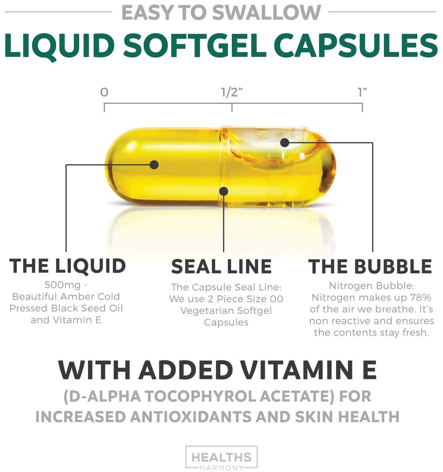 - Cold-pressed black seed oil softgel capsules: We source the wonderful plant nigella staiva from its natural home, capture it all in a 500mg capsule along with natural vitamin E (D-alpha Tocopherol) and manufacture it right here in the USA. The result is a superior-quality black cumin seed oil supplement that conveys all the benefits in an easy-to-swallow liquid capsule with no foul taste.