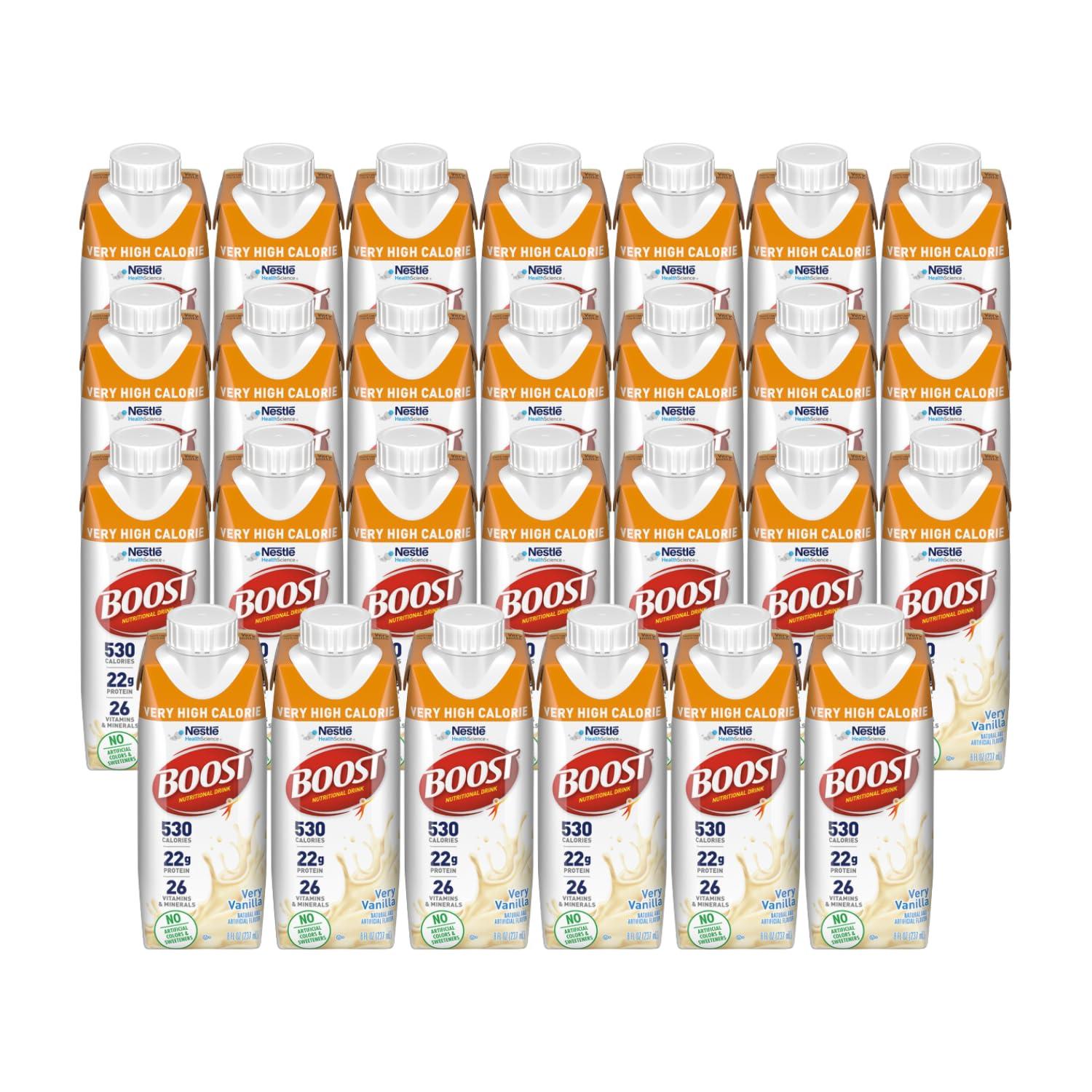 - COMPLETE BALANCED NUTRITION: BOOST Very High Calorie is a calorically-dense balanced nutritional drink & can be used as a snack or mini meal for those with low appetites. Available in a tasty vanilla flavor.