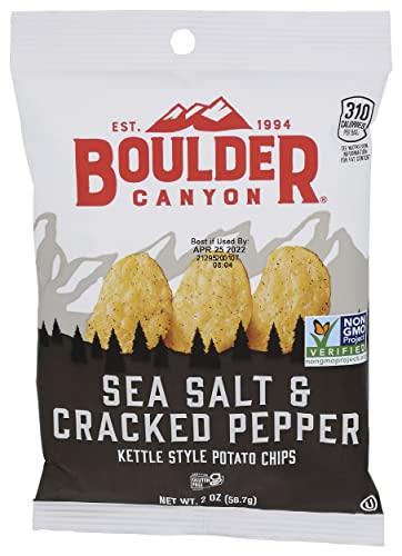 Boulder canyon kettle cooked potato chips, sea salt & cracked pepper are made with premium american grown potatoes which are then kettle cooked in small batches and seasoned to perfection. These thickly sliced and deliciously crunchy chips are vegan, kosher, gluten-free and Non-GMO and they also do not contain trans fat, msg or cholesterol. Wake up your snacking with this perfect combination of zesty sea salt and cracked pepper. Each bag of boulder canyon kettle cooked potato chips, sea salt & cracked pepper contains 2 ounce of product.