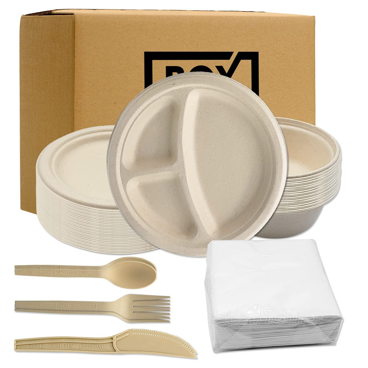- SETS BIODEGRADABLES BEIGE of 200 PCS : 25 three compartment paper plates heavy duty 9 inch, 25 bowl plates 350 ml (12 Oz) special for soups or creams, 25 small plates 7 inch for pastels, creams or dessert, 25 uds spoons, 25 forks, 25 knives and 50 napkins double layer