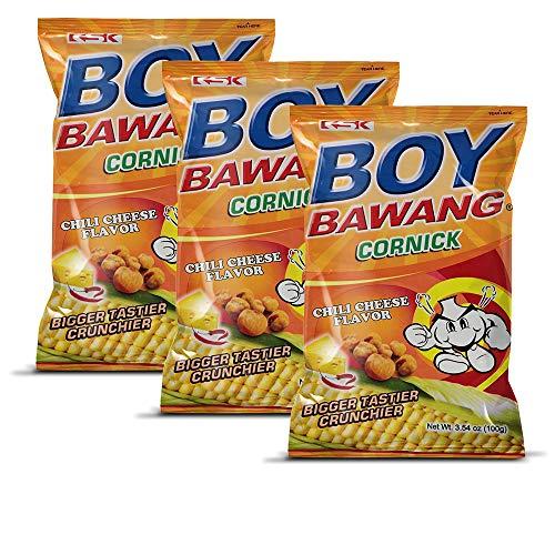 - Contains three (3) packs of Boy Bawang Cornick, Chili Cheese - Crispy Tasty & Gluten-Free Corn Nuts 3.54 ounces (100g)