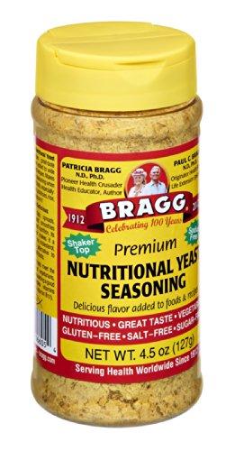Bragg Premium Nutritional Yeast Seasoning, 4.5 Ounce -- 12 per case. Provides great-taste and nutrition when added to a wide variety of foods and recipes. Makes a healthy delicious seasoning when sprinkled on most foods, especially salads, vegetables, potatoes, rice, pasta and even popcorn! Add to soups, dips, spreads, cereals, juices and smoothies for added flavor and nutrition. Its "cheese-like" flavor makes it a great low-sodium, cholesterol-free, delicious, healthy addition to recipes and foods. In addition to its great health benefits below, Bragg Premium Nutritional Yeast Seasoning is a versatile culinary ingredient for most recipes. It can be used as a condiment or in a wide range of recipes. Bragg Premium Nutritional Yeast Benefits: -- Non-GMO -- Vegetarian -- Gluten-Free -- Great Taste -- Nutritious -- Sugar-Free -- Vitamin B including natural Vitamin B12 (B12 from Cobalamin) -> Kosher Certified