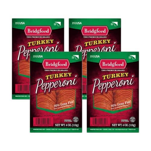 Bridgford Bridgford Sliced Turkey Pepperoni 4 oz Pack of 4 - Pepperoni Slices for Pizza and Sandwiches - Naturally Smoked Turkey Pepperoni for Low-Carb Keto Diets - Healthy Pepperoni Alternative for Snacking