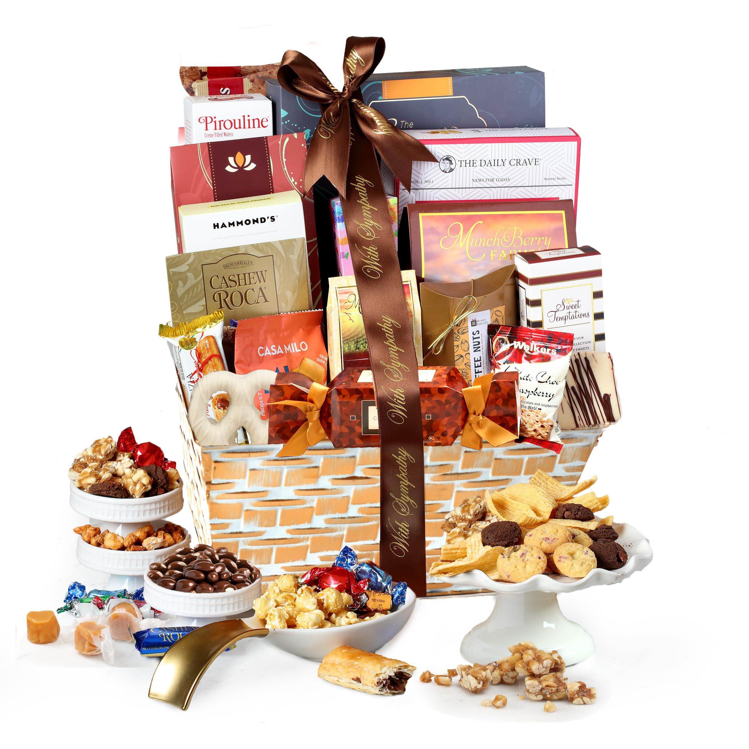 • BEST-SELLING ASSORTMENT: Filled with 4 lbs of our popular snacks, selected from our customer favorites. This sympathy gift basket includes gourmet cookies, popcorn, chocolates, candy, nuts and more. Each gift basket measures 12" x 8" x 14".