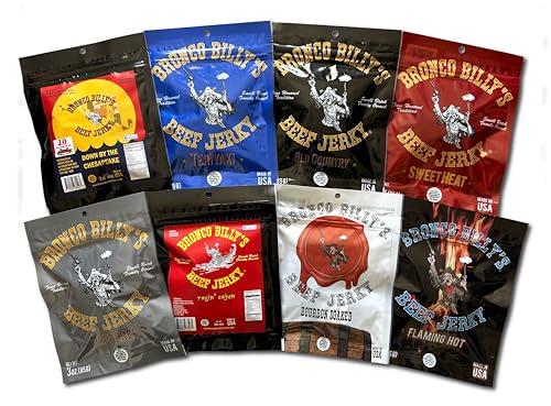 Now you can try all of Bronco Billy's delicious beef jerky flavors in one convenient eight pack! Whether you're looking to find the flavors you like best or if you just like the variety, we are glad to offer you this 8-pack sampler. The eight Bronco Billy's Beef Jerky flavors are Old Country, Flaming Hot, Teriyaki, Peppered, Sweet Heat, Down By The Chesapeake, Ragin' Cajun, and Bourbon Soaked. With this purchase you will receive a 3 ounce pack of each flavor of these scrumptious snacks! These are a great idea for gifts, military care packs, or to sample all of the flavors to find which ones you like best!