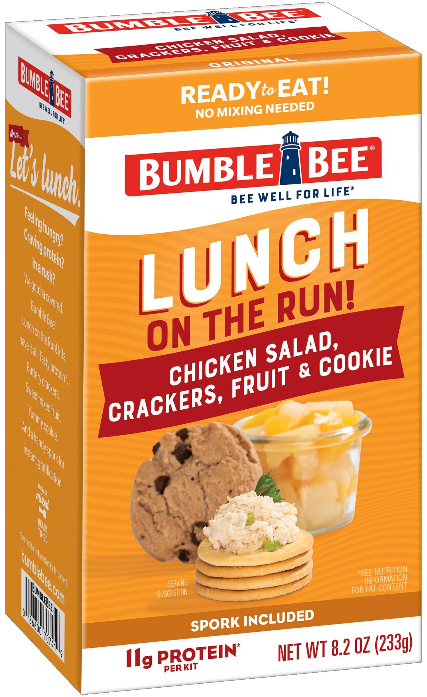 • SHELF STABLE CHICKEN SALAD KIT: Bumble Bee Lunch on the Run! chicken salad with crackers kits require no refrigeration and are already mixed and ready-to-go wherever life takes you; Perfect for outdoor activities like hiking, biking, camping and sports