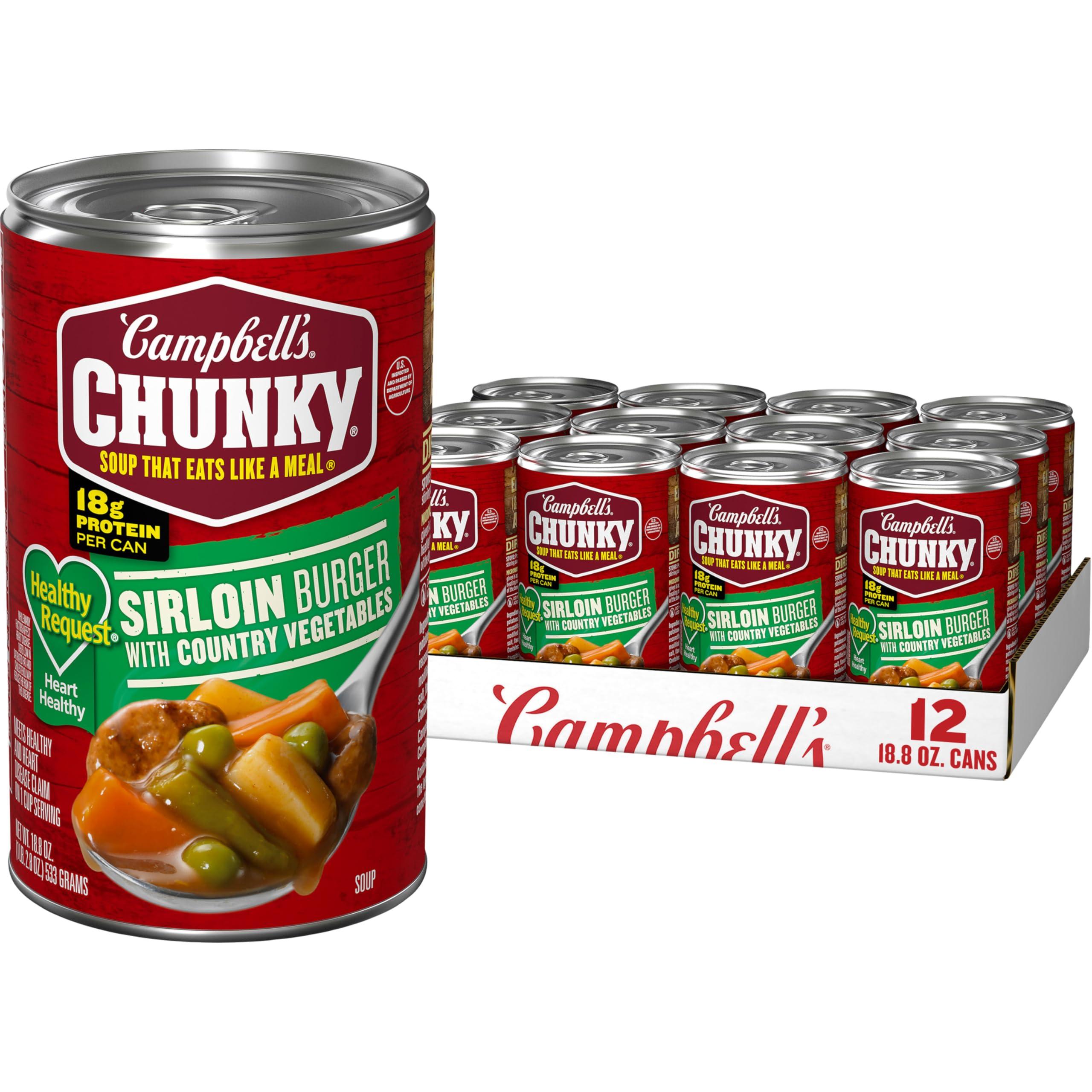 - Campbell's Chunky Soup: Twelve (12) 18.8 oz cans of Campbells Chunky Healthy Request Sirloin Burger with Country Vegetable Beef Soup