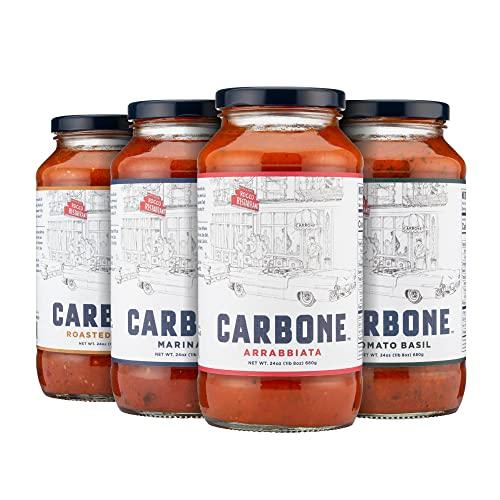 - MORE TO LOVE: One jar just isnt enough, so this variety pack of specialty Carbone sauces gives you one jar EACH of the Arrabbiata, Marinara, Roasted Garlic, and Tomato Basil for a total of 4 jars. Enjoy your favorite pasta sauce in the comfort of your own home - no reservation required! All flavors available in 2-pack jars as well.