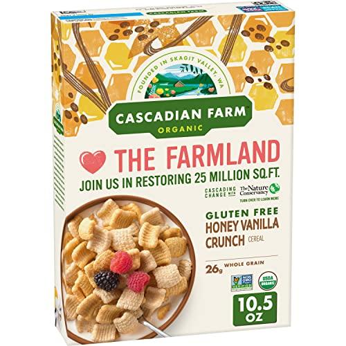 Cascadian Farm Organic Gluten Free Honey Vanilla Crunch Cereal features cereal pieces made with whole-grain corn, sorghum, sweet potato and chickpeas. Enjoy this tasty gluten-free cereal with milk or by the handful as an on-the-go snack. With 26 grams of whole grain per serving, it's a delicious addition to your day. This tasty organic cereal will be a hit for the whole family. Try some as a topping to Greek yogurt, mixed fruit or your favorite ice cream. 26g whole grain per serving. At least 48g recommended daily. Always Organic. Never Ordinary. Thats been our mantra since 1972. Since then, weve remained a producer of organic cereals, fruits, vegetables, granola and snack bars. Cascadian Farm is a pioneering supporter of farmers who use practices that regenerate the land and their communities.