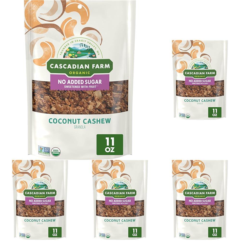 - COCONUT CASHEW GRANOLA: Organic granola made with whole-grain oats, date powder, coconut and cashews