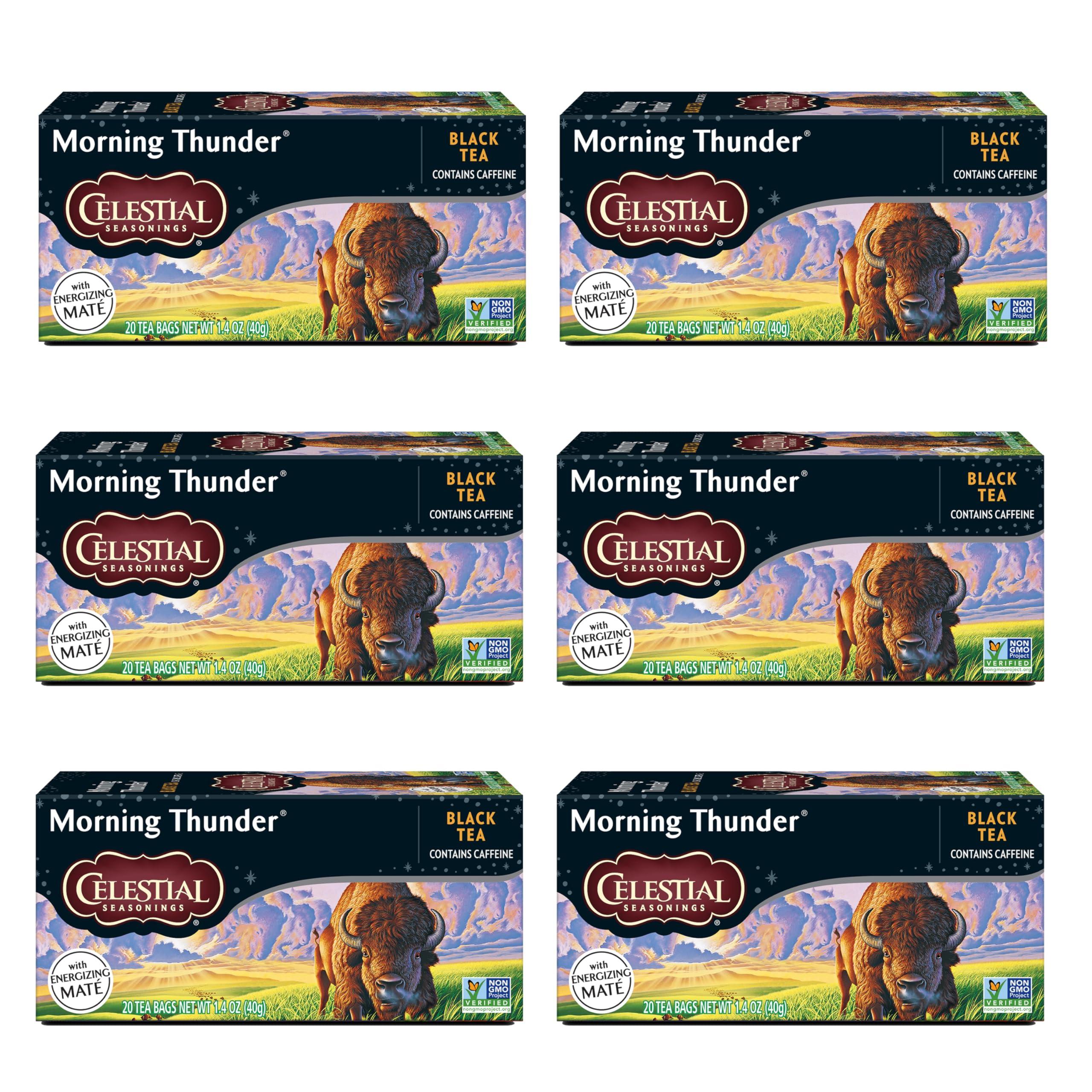 Nothing is more soothing than a cup of your favorite tea. Celestial Seasonings Morning Thunder Black Tea is the perfect caffeinated addition to your daily routine. This exhilarating blend is full of boldness that you can enjoy throughout the day, but it's the perfect way to start your day. Put some magic in your mug and enjoy the goodness found in every cup of Celestial Seasonings Teas. Celestial Seasonings teas are an invitation to put some magic in your mug! When we started Celestial Seasonings in 1969, we were inspired by the awesome power of nature right outside our door in the Rocky Mountains. We foraged the fields and forests for herbs and botanicals, creating unique and delicious blends as Americas first herbal tea company. Today were still crafting tea in Boulder, Colorado under the watchful eye of our Blendmaster, creating teas that are bursting with benefits, flavor, and our passion for inspiring a happier and wholesome life. *Recycled Paper Certification Hain Celestial 2/20/24