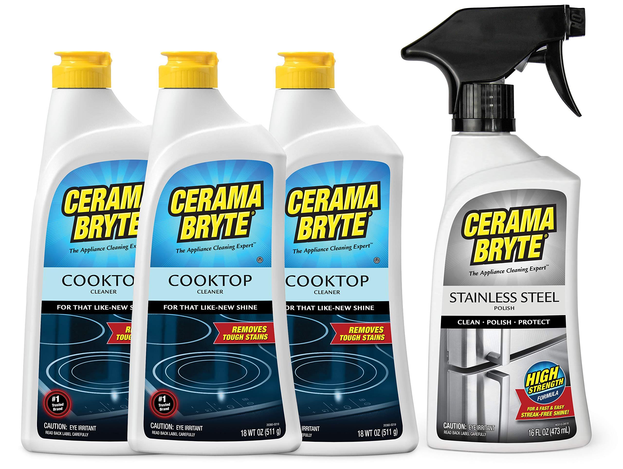 - Contains: 3 - 18 Ounce Bottles of Cerama Bryte Cooktop Cleaner & 1 - 16 Ounce Bottle of Cerama Bryte Stainless Steel Polish