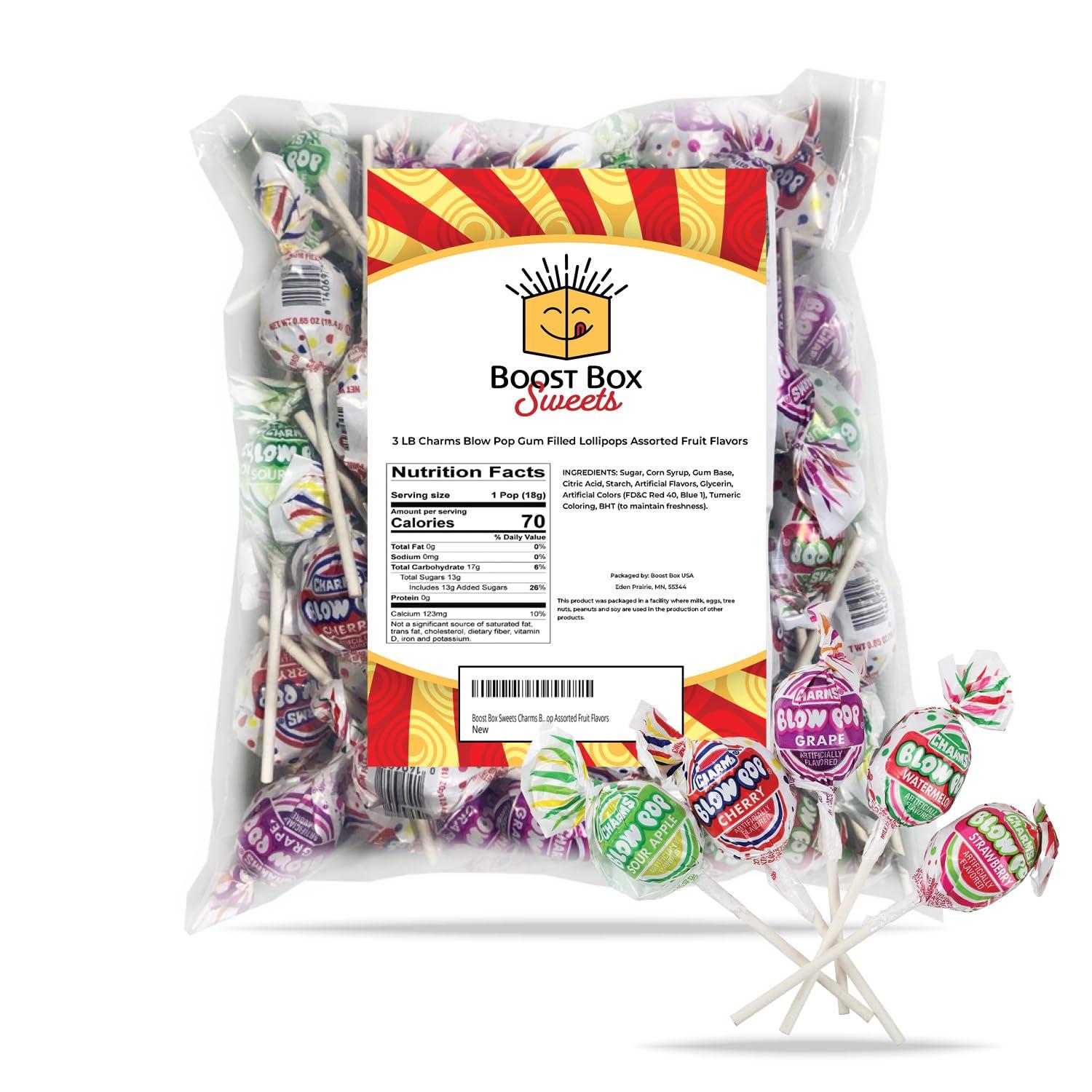It's two lollipop treats in one with Charms Blow Pop, a chewy, bubble gum center surrounded by a delicious, fruit-flavored, hard candy shell. Available in a variety of great-tasting flavors that include traditional fruit varieties and more contemporary favorites - these pops are the world's most popular gum-filled lollipop.