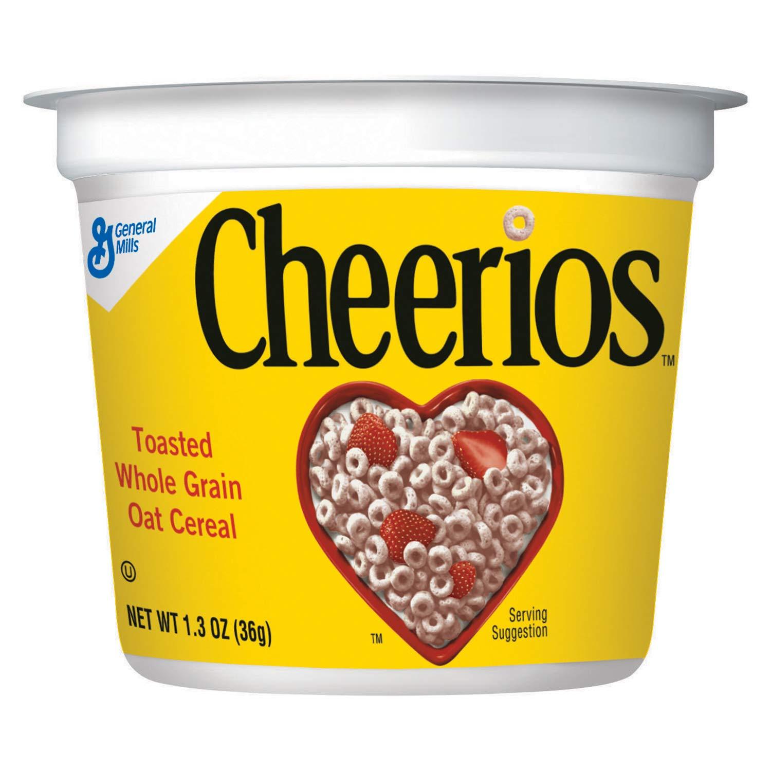Cheerios Cereal is made with 100% whole grain oats. These little Os with soluble fiber can help lower cholesterol as part of a heart healthy diet* (*Three grams of soluble fiber daily from whole grain oat foods, like Cheerios cereal, in a diet low in saturated fat and cholesterol, may reduce the risk of heart disease. Cheerios provides 1.5 grams per serving.) Dig into a bowl with milk as a delicious and wholesome start to your day. Every serving of this gluten free toasted whole grain oat cereal provides 34g of whole grain (at least 48g recommended daily), a good source of calcium and fiber, and 11 vitamins and minerals, with no artificial flavors or colors. Beyond a quick heart healthy breakfast food for adults, this whole grain cereal makes an easy, gluten free kids snack by the handful. Pack some crispy cereal in a lunch box for a yummy school treat. Or make it an ingredient in your favorite cereal bars recipe. However you enjoy Cheerios, it's a part of General Mills cereals, spreading goodness from tots to grown-ups.