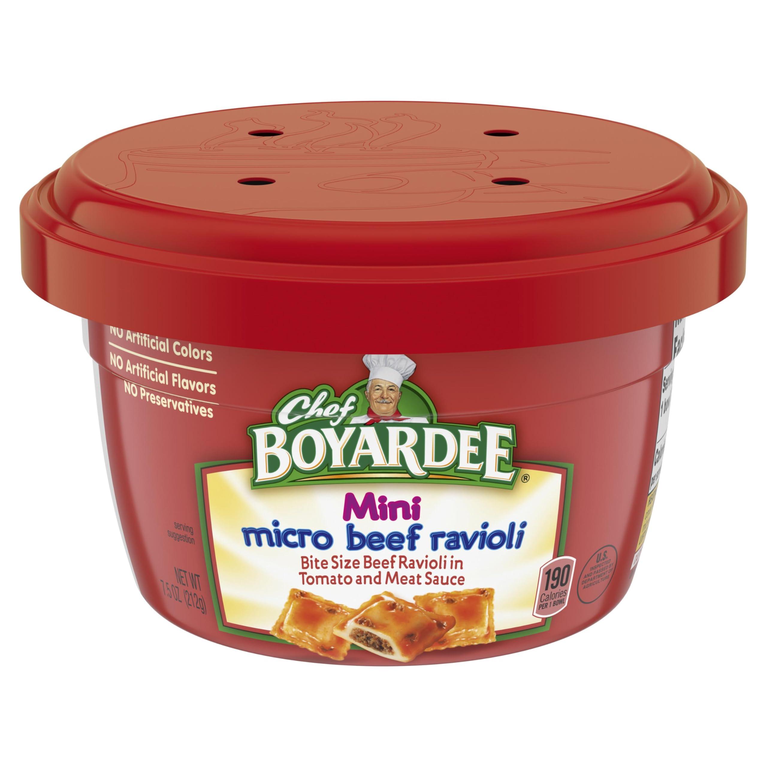 - Twelve 7.5 oz bowls of Chef Boyardee Mini Micro Beef Ravioli