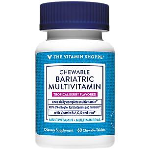 Complete multivitamin Targets the needs of weight loss surgery patients Free of gluten, dairy, and soy Tropical Berry flavor Who knew getting a well-rounded dose of goodness could be so easy and so delicious? Formulated specifically for the nutritional needs of weight loss surgery patients, this complete multivitamin from The Vitamin ShoppeA brand delivers 100% or more of the daily value of 18 vitamins and minerals, including vitamin B12, C, and D. This once-daily chewable also features 9mg of iron.