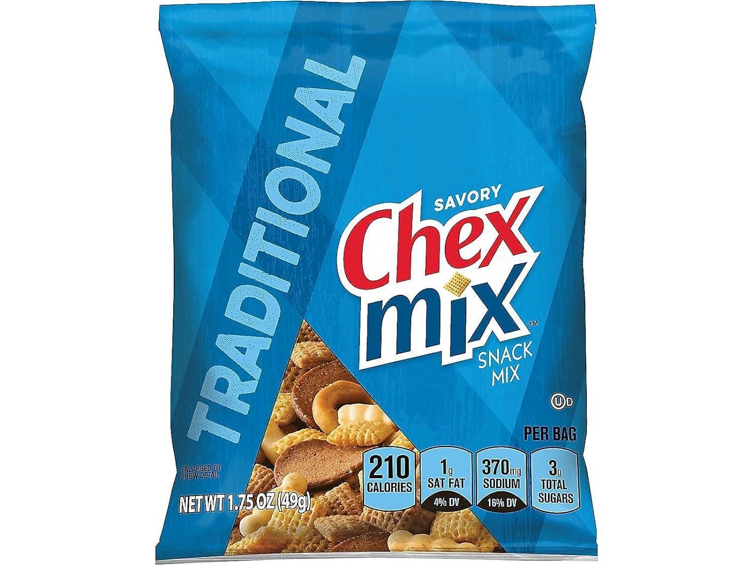 A mix of whole grain Chex(TM) cereal pieces, pretzels, mini breadsticks, and crispy crackers mixed with a unique flavor. Individually wrapped in a single serve portion for a convenient, grab and go snack with 60% less fat than potato chips. Available in bulk, 60-1.75 oz bags.