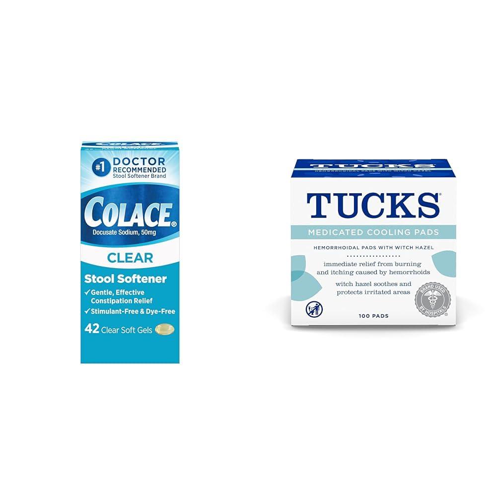 This 42-count bundle combines Colace Clear Stool Softener Capsules and TUCKS Medicated Cooling Pads to provide gentle, effective relief from occasional constipation and hemorrhoid discomfort. The Colace Clear Stool Softener Capsules are doctor-recommended to softly relieve constipation without harsh stimulants or dyes. Each small, easy-to-swallow gel cap contains 50mg of docusate sodium to gently increase water in the stool. Colace is the #1 doctor-recommended brand for comfortable constipation relief during pregnancy, after surgery, or for those with conditions like hemorrhoids. The 100-count TUCKS Medicated Cooling Pads can be used to soothe irritation and discomfort from hemorrhoids, providing immediate relief from burning and itching. The witch hazel-infused pads can also be used after childbirth or rectal surgery. TUCKS pads are pH-balanced, hypoallergenic, ultra-soft, and dye-free. Together, these two products work to relieve occasional constipation discomfort and irritation in a gentle, non-stimulant, doctor-recommended way. The Colace capsules soften stool while the TUCKS pads provide immediate cooling relief from external irritation and discomfort.