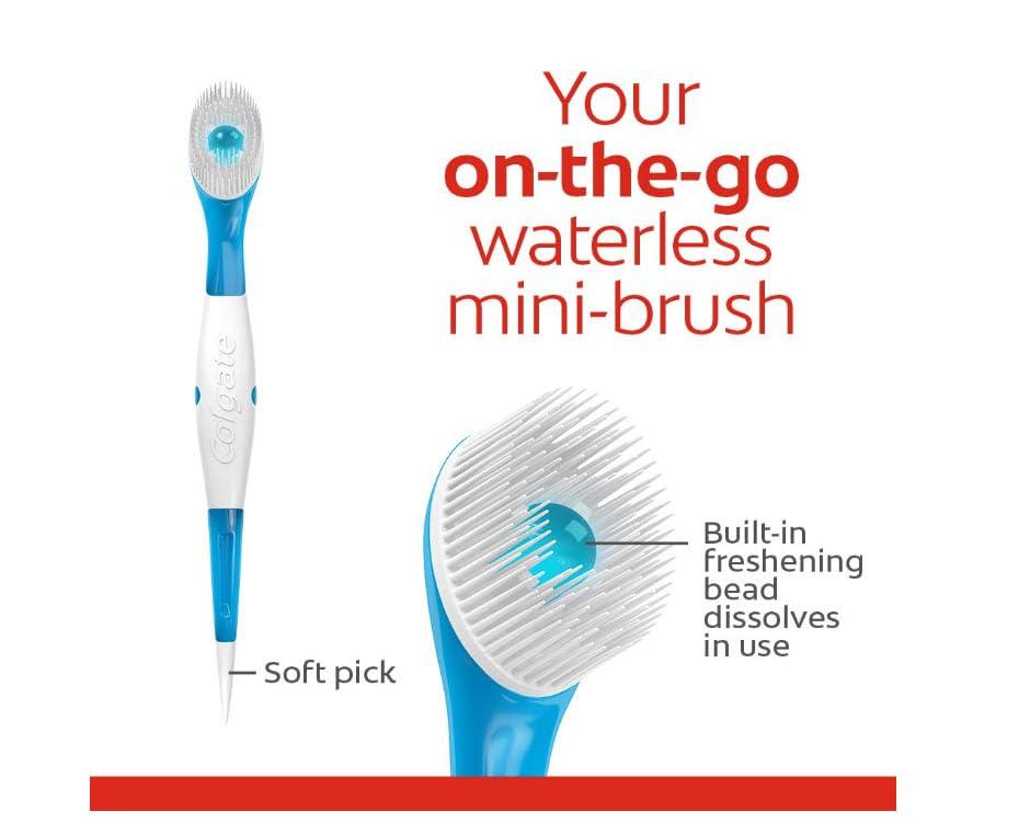 Get clean teeth and fresh breath on the go with the Colgate Max Fresh Wisp Disposable Mini Toothbrush, Peppermint. This pocket-sized mini-toothbrush brush delivers the freshness of gum and the clean of a toothbrush in one effortlessly portable device. Its built-in, sugar-free peppermint bead easily dissolves and delivers a rush of minty freshness while the bristles gently remove food and other particles. A soft pick at the handle base of this disposable toothbrush removes food particles from any hard-to-reach areas. No water or rinsing is necessary. Recycle with Terracycle.