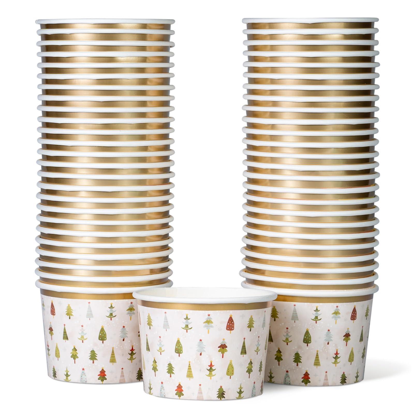 - Bulk Paper Ice Cream Cups: Set includes 50 single-serve paper dessert bowls with Xmas tree illustrations and gold foil embellishments. Designed for ice cream shops, concession stands, caterers, and restaurants. Suitable for serving large events, kids' birthday parties, baby showers, and gatherings.