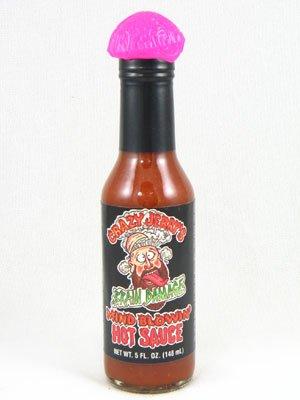 Crazy Jerry's Brain Damage Mind Blowin Hot Sauce (5 FL.OZ. / 148 ml): We call the dude on the label the Bones Man. He's a hard ridin' biker buddy of mine; who is always thought of himself as a bad motor scooter, until he tried the Brain Damage Mind Blowin Hot Sauce. Now this hot sauce is not for wimps or people just eat up with I.Q. It is for people like Bones...people with an adventurous soul looking for cheap thrills. The kink of folks who get their kicks Spittin' into the wind or arm rasslin with big women. Like Bones Man says every time he eats Crazy Jerry's Brain Damage Mind Blowin Hot Sauce - Thank gawd the only time I need my brains is when I ride. Have a great and Hot day. Crazy Jerry ain't so crazy after all... this stuff is GREAT. Ingredients: Mandarin Oranges, Honey, Mango, Habanero Peppers, Distilled Vinegar, Water, Garlic, Chipotle Pepper, Sugar, and Spice. Brand: Crazy Jerry's Sauces Manufacturer: Crazy Jerry's